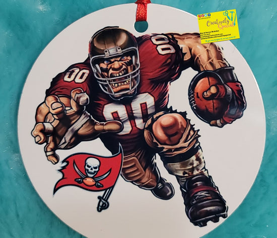 Aluminum Ornaments 3.15” Double sided, Round, hole with red ribbon for hanging! Makes a great gift for any NFL fan in your life.
